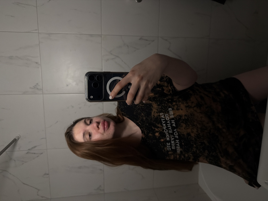 The image depicts a female individual taking a mirror selfie inside a bathroom. The specific location in Surgut, Russia, cannot be determined from the visual information provided. **Subject:** A young female, appearing to be in her late teens or early twenties, is captured from mid-thigh up in the reflection of a mirror. She has long, reddish-brown hair and displays some facial redness and minor blemishes. Her lips are slightly puckered. She is wearing a loose-fitting, short-sleeved, black t-shirt with a bleached or tie-dye brown pattern. White Cyrillic text, reversed in the mirror, is visible on the t-shirt, which reads in correct orientation, "ЭТО ПОНЯТНО? ЕЩЁ НАДО ХУЙ." Her lower body is not visibly covered beyond the t-shirt. **Action:** The female is holding a dark-colored smartphone, likely an iPhone with a triple camera array and a MagSafe-compatible clear case, in her right hand (left in reflection) to capture her reflection in the mirror. She is looking towards the camera. Her thumbnail on the visible hand is painted a light color. **Environment:** The background is a bathroom, characterized by light-colored, possibly white or off-white, rectangular wall tiles with a faint grey marble-like pattern. A portion of a white bathtub is visible in the lower left of the reflection. A metallic rod, possibly a towel rail or shower curtain rod, is visible in the upper left of the reflection. Artificial lighting is present.