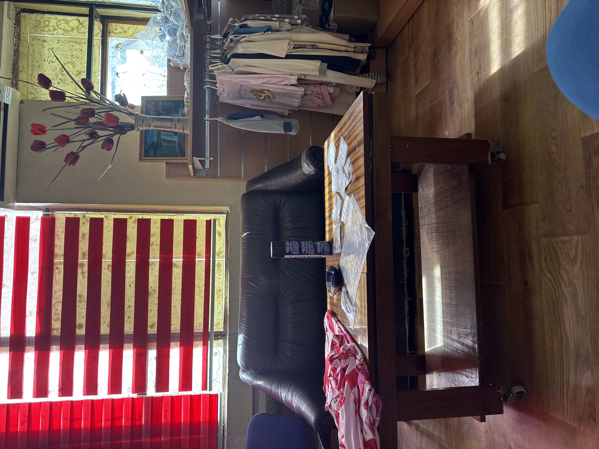This image depicts an indoor commercial or waiting area located in Sandanski, Bulgaria. The scene is dominated by a dark brown or black tufted leather-like sofa positioned centrally against a light-colored wall. To the left of the sofa, a radiator is visible below a window covered with red and translucent horizontal striped blinds. A partial view of a blue chair back is present in the far left foreground. In front of the sofa stands a rectangular wooden coffee table with a lower shelf, supported by four legs, two of which are fitted with small caster wheels. On the table, from left to right, are a folded red and white patterned garment, a small blue and white ceramic ashtray, a black aerosol spray can with white labeling, and multiple scattered clear plastic bags containing labels or small items, along with several loose white papers. Sunlight casts distinct rectangular patterns across the table surface and the floor. On the right side of the frame, a light-colored wooden shelving unit functions as a display. The top shelf holds a tall, textured cylindrical vase containing artificial red tulip-like flowers with green stems. Behind the vase, a framed picture depicting a waterfall scene is visible. To the right on this shelf, clear plastic material is piled. Below this shelf, a metal clothing rack is attached, displaying various garments on hangers, including loungewear or pajamas in colors such as light blue, pink (one with "Good Morning" text and a bear graphic), cream, and patterned fabrics. Further shelving and storage, including cardboard boxes, are visible below the clothing rack. A second window, characterized by old, possibly stained frames and etched glass, is visible in the background on the far right, revealing a bright, blurry outdoor view. The floor is covered with light brown wood-effect laminate or vinyl flooring. No individuals are present in the image.