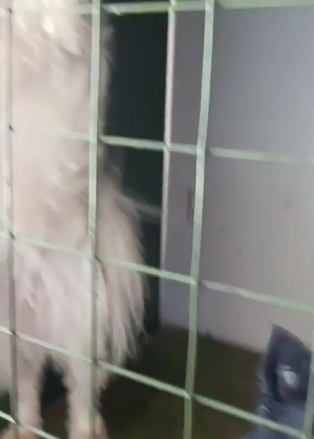 two dogs inside a green wire cage. One dog is mostly white and stands on its hind legs, its front paws on the wire mesh of the cage, and looks out with dark eyes. The other dog is black with a white marking on its chest and looks towards the camera. The environment appears to be an indoor kennel.
