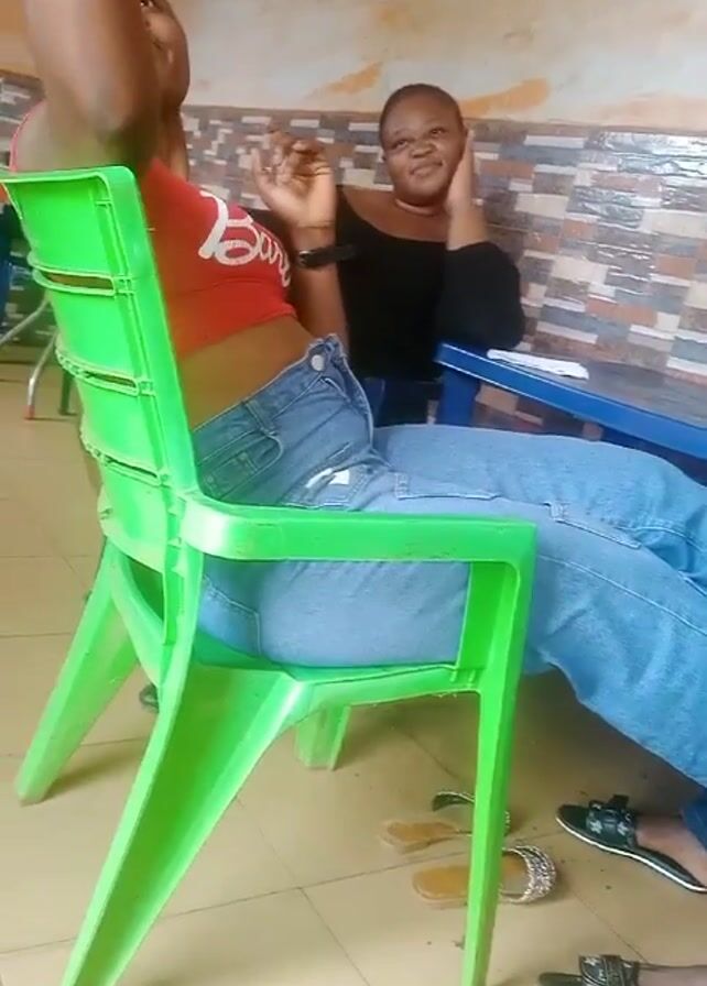 two women seated by a small table in an indoor area. The woman in the foreground is sitting in a bright green plastic chair, wearing a red crop top and light blue jeans. She has her right arm raised and appears to be gesturing as she speaks. The second woman is seated behind her, wearing a black off-the-shoulder top. She rests her chin on her hand and looks towards the camera. On the floor around the chairs are several pairs of sandals. The wall behind the women has a patterned tile or brick appearance, and the floor is covered in light-colored tiles. The lighting suggests an indoor or partially shaded outdoor setting.