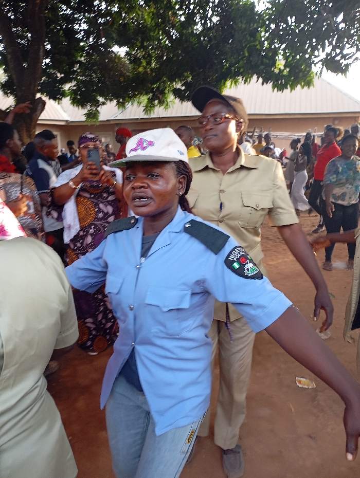 The image depicts an outdoor gathering in the city of Akwanga, Nigeria. In the foreground, a female individual, identified as a Nigerian Police officer, is prominently featured. She wears a light blue short-sleeved uniform shirt with dark shoulder epaulets and a "NIGERIA POLICE" patch visible on her left sleeve, light blue denim jeans, and a white baseball cap with a red 'A' logo worn backward. Her mouth is slightly open, and her arms are slightly extended laterally. Directly behind her, a second female individual, also in uniform, wears a khaki-colored short-sleeved collared shirt with two front pockets, matching trousers, eyeglasses, and a dark cap. This individual is looking towards the right side of the frame. A third person, partially visible on the far left, wears a similar khaki uniform. In the midground, a diverse crowd of individuals in various civilian attire is present; one woman is seen holding a smartphone vertically, potentially recording the scene. The ground is reddish-brown earth. The background includes a large tree with green foliage, sparse other vegetation, and a light-colored building with a corrugated metal roof. The scene is illuminated by natural daylight.
