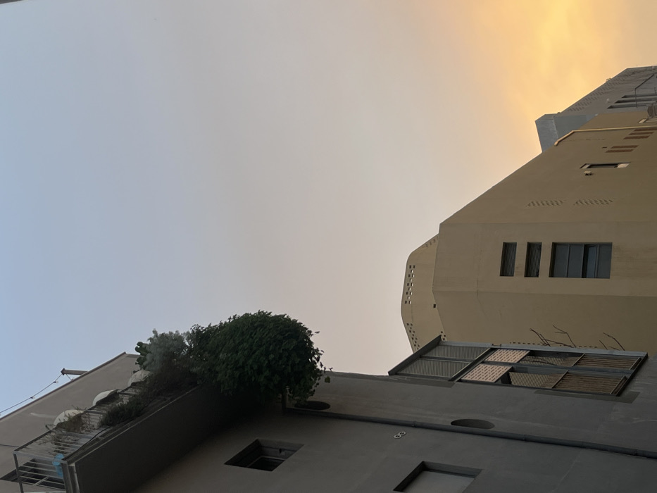 The image depicts an urban architectural scene in Tel Aviv-Yafo, Israel, characterized by its Bauhaus and International Style buildings under a twilight sky. In the left foreground, a multi-story grey residential building is visible, angled upwards. Its upper levels feature a balcony with a metal railing, from which a dense mass of dark green foliage, including a large cascading vine, heavily overhangs and partially obscures the facade. Multiple air conditioning units are discernable on the balcony floor amidst other potted plants. Rectangular windows with dark frames are present on the building's side. A vertical dark pipe or conduit runs along the left edge of this structure. To the right and further back, a light beige or cream-colored building stands, exhibiting characteristic rounded corners and a multi-tiered or stepped roofline with a crenellated edge. This building features horizontal recessed window or vent openings and at least one larger rectangular window on a lower visible section. Small, regularly spaced indentations are visible on its facade. The sky occupies the upper two-thirds of the image, displaying a gradient from a pale, hazy blue at the top and left, transitioning to a distinct orange and yellow hue towards the right and bottom, consistent with either sunrise or sunset conditions. No individuals, vehicles, or discernible activities are present in the frame.