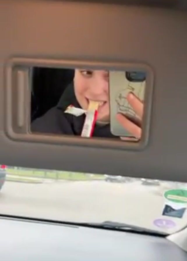 The video is taken from inside a car looking out the windshield. The car is in traffic. The sun visor mirror is pulled down and reflecting a person in the driver’s seat brushing their teeth with a toothbrush. The person is smiling at their reflection while holding a smartphone to film. The phone case features a hand-drawn design.