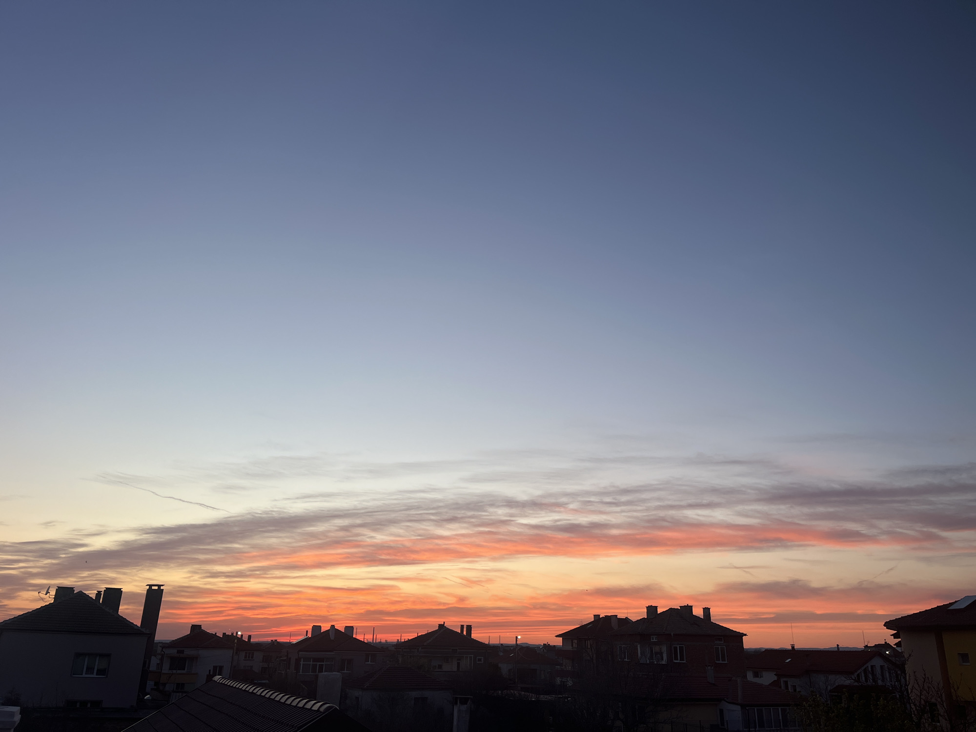 sunset over a city. The sky is a gradient of colors, ranging from light blue at the top to orange and pink near the horizon. There are clouds in the lower portion of the sky. The silhouette of rooftops is visible in the foreground. The location is the city of Unknown, Unknown.