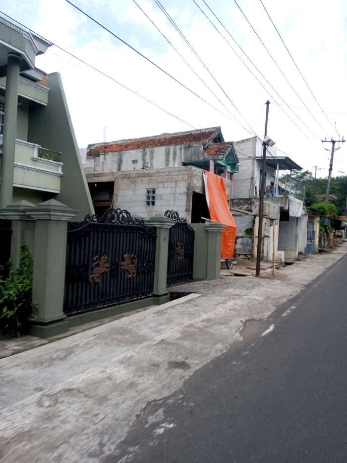 The image depicts a daytime street scene in Khajuripada, India, under an overcast sky. In the immediate foreground on the left, a black wrought-iron gate featuring four gold-colored lion emblems is set within light-green concrete pillars. Behind this gate stands a modern, multi-story building characterized by light-green walls, sharp architectural angles, and a small balcony. To its right, an adjacent structure, possibly under construction or renovation, is visible, composed of grey concrete blocks and topped with a red-tiled roof. A large orange tarp hangs down the front of this building, partially obscuring its lower section. Further down the street, an asphalt road extends into the distance, paralleled by a concrete sidewalk on the left. A row of various residential or commercial buildings lines the right side of the road, including one with a red-tiled roof and a distinct teal-colored gable. Multiple black electrical wires crisscross the sky across the upper portion of the frame. Two utility poles are visible, with one pole near the center-right supporting a street light fixture. Faint human figures are discernible on an upper-level balcony of a building further along the street. A light-colored, wheeled object, consistent with a handcart, is positioned near the orange tarp. The background features additional distant structures and scattered trees. No specific actions or direct interactions between individuals are discernible.