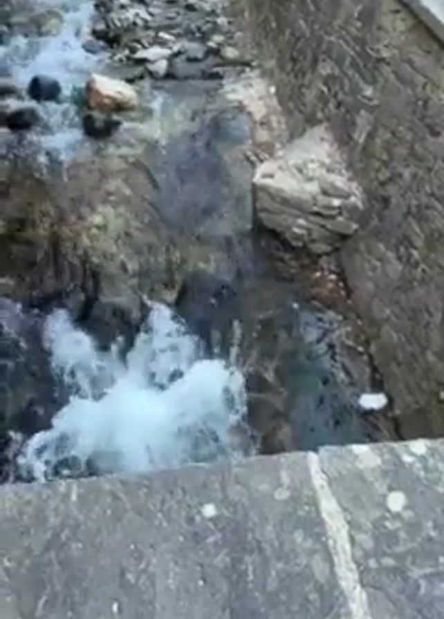 rocky stream flowing beneath a stone arch bridge. The stream is lined with stone walls, and a building is visible in the background. The water is clear and turbulent, cascading over rocks. The building in the background has a red-tiled roof and a sign that reads "BAKATOPKA." The camera pans up to reveal the bridge and the surrounding scenery.
