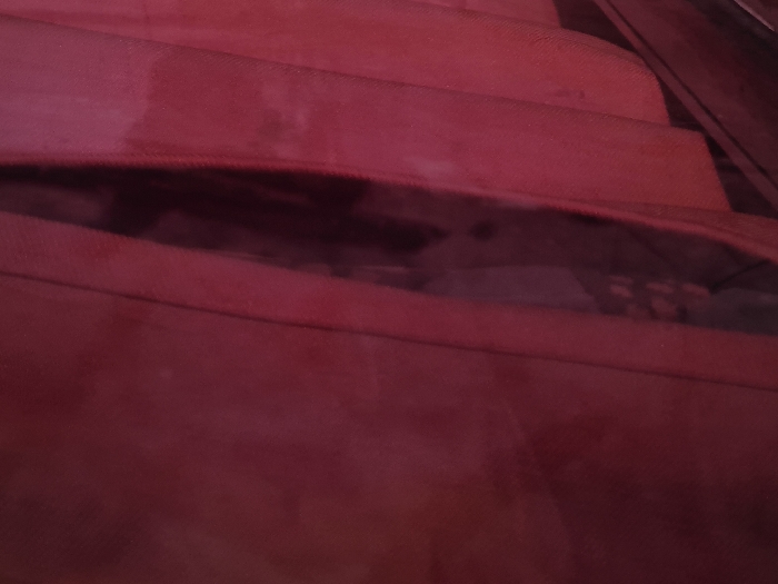 The image displays a dimly lit, vertical composition, reportedly captured within Al-Qaboun Municipality, Syria. The majority of the frame is occupied by a dark reddish-brown material, consistent with fabric, possibly a curtain or drapery, which exhibits subtle vertical folds and some lighter, irregular patches that could indicate discoloration or dust. A prominent, vertical gap or tear in this fabric is visible slightly to the right of the image center, revealing a profoundly dark and indistinct space behind it. Within this obscured background, faint, unidentifiable lighter shapes and textures can be vaguely discerned. No human figures, specific objects other than the fabric, or discernible actions are present. The overall scene is characterized by low light, giving it a somber and obscured appearance.