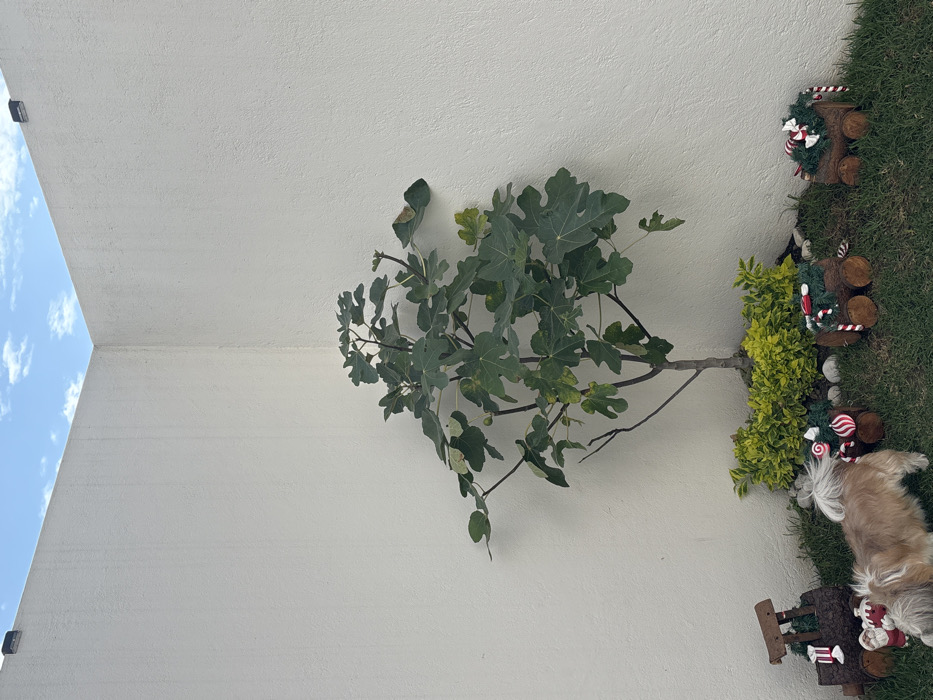 A fig tree extends from a grassy area beside a white wall. The grass contains decorative wooden logs resembling train cars, adorned with festive wreaths and candy canes. A small, long-haired dog lies on the grass near the decorations. The wall intersects with another at a sharp angle, revealing a view of a bright blue sky with scattered clouds. The image appears to be taken from a low angle.
