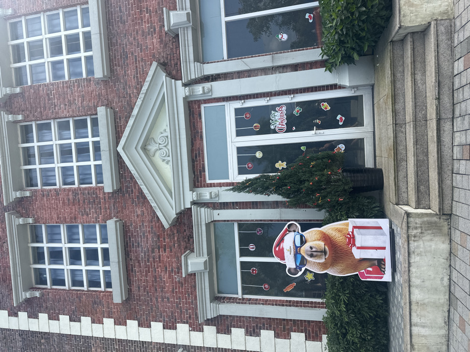 A red brick building with windows and a door decorated for Christmas. The windows are multi-paned with white frames. A Christmas tree in a black pot sits near the entrance. A large cardboard cutout of a capybara wearing a Santa hat and sunglasses, holding a gift, stands to the right. Christmas-themed stickers are visible on the door and windows. The building has ornate white trim. A set of stairs leads to the entrance.