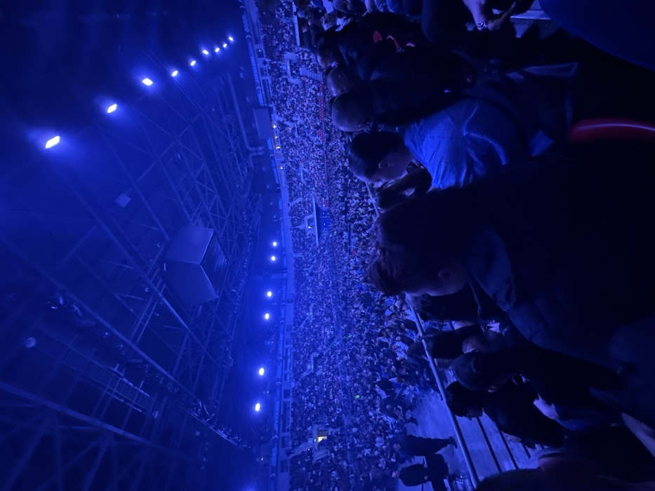 The image captures the interior of Arena Armeec, now known as Arena Sofia, located in Sofia, Bulgaria, during an event. The entire scene is bathed in pervasive blue artificial lighting, creating a dark, monochromatic environment. A vast audience fills the tiered seating sections, extending from the lower bowl to the upper decks of the arena, with individual faces largely obscured by distance and lighting conditions. In the immediate foreground, several individuals are visible from behind, seated in dark-colored chairs with reddish backs. One individual on the left has dark hair styled upwards and wears dark clothing. Adjacent to them on the right, another person with lighter hair wears a blue garment that distinctly reflects the ambient lighting. The ceiling structure features exposed metal trusses, from which multiple blue-emitting lights are suspended, along with a large, square, dark object. A banner displaying "АРЕНА АРМЕЕЦ" and the digits "8888" is visible along the upper perimeter of the seating area. Two security personnel, dressed in dark uniforms, are positioned near a barrier in a lower section of the arena, to the left of the frame.