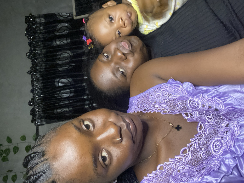 A selfie-style photo features three individuals lying down. The closest person wears a light purple lace-trimmed top with a gold necklace and a nose ring, displaying braided hair. A second person, positioned between the first and a baby, wears a dark, ribbed garment. The baby, dressed in yellow, lies above the second person. Behind them, black patterned curtains hang, and a green leafy plant is visible on the left.