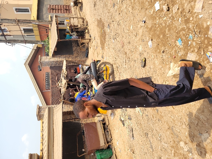 The image captures an outdoor scene under bright, hazy daylight on an unpaved, dusty road in the city of Unknown, Unknown. In the foreground, a young adult male with dark skin and short dark hair walks left, wearing a black short-sleeved button-up shirt, dark blue trousers, and black slip-on sandals. His right hand is in his pocket, and a chain is visible around his neck. In the midground, a group of individuals congregates around two informal market stalls constructed with corrugated metal or makeshift roofs. One person, wearing a patterned shirt, is seated on a yellow motorcycle, facing right, while another in a blue shirt stands nearby. Further right, a person in a light blue top tends to a small wooden stall displaying produce, likely plantains. A person is partially visible on the far right, bent over. The background features a reddish-brown building with a prominent gable roof and dark metal fencing, framed by stone-clad pillars. A partially legible sign reading "HOU..." or "HOUSE..." is visible on its facade. To the right of this building stands a taller, multi-story beige structure with multiple windows. Utility poles with exposed wiring are visible in front of this building. The ground consists of dry, reddish-brown dirt, littered with various debris including plastic bags, paper, and other discarded items. The sky is a light, clear blue with a noticeable haze.