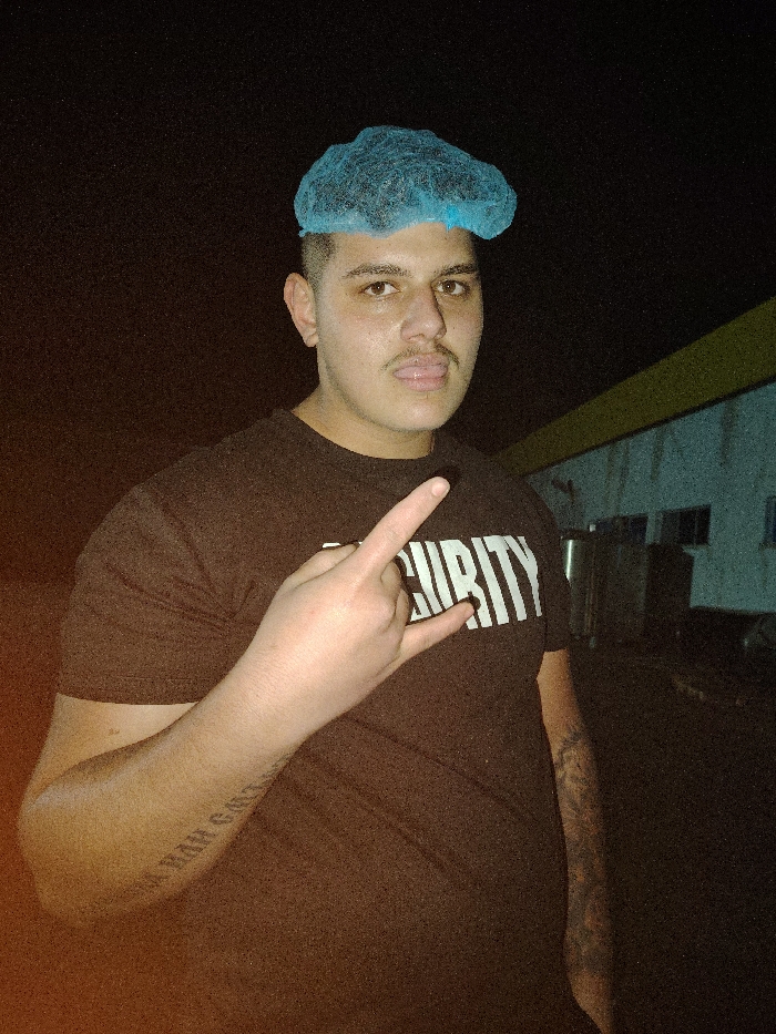 A young adult male is depicted in a medium shot, centered in the frame, against a dark, indistinct background. He has a light complexion, short dark hair partially covered by a light blue disposable hairnet, and a visible mustache. His eyes are dark, and his tongue is slightly extended. He wears a dark, short-sleeved t-shirt with "SECURITY" printed in white, block letters across the chest. His right hand is raised, performing a "rock and roll" gesture with the index and pinky fingers extended. Visible tattoos are present on both forearms; text is discernible on the left forearm. The setting is under low light conditions, with the subject illuminated by what appears to be a direct light source. In the blurry background, to the subject's right, a section of a building with a light-colored wall texture and a horizontal yellow trim is faintly visible. The specific location within Yambol, Bulgaria, is not discernible from the image content.