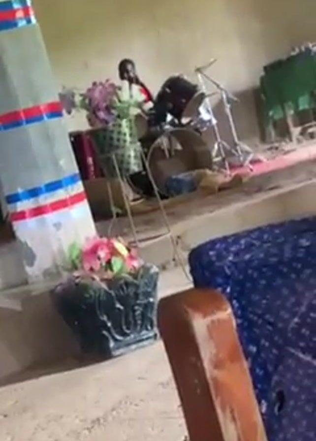 A blurry view from behind a chair shows a room with musical instruments, including drums. A person in an orange sequin dress and white head covering is seen as the camera moves closer. A man in a suit is at a podium.