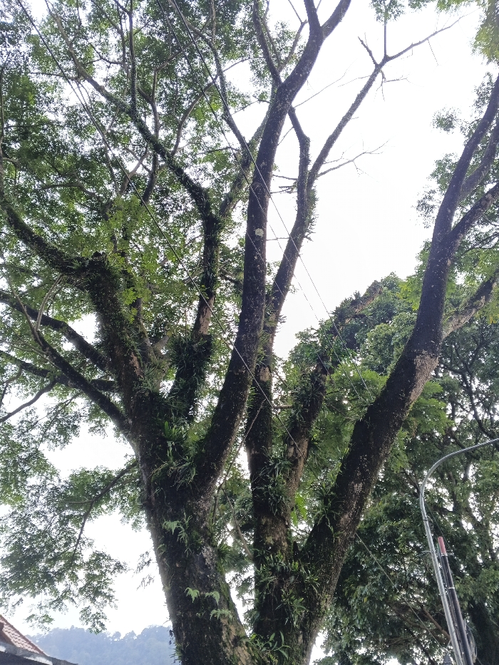 A large, mature tree dominates the view, its thick trunk splitting into numerous branches reaching towards the sky. Dense green foliage fills the upper portion of the frame. Smaller plants and moss cling to the tree's bark, adding texture and visual interest. Powerlines crisscross the branches. A streetlamp and rooftops are visible along the lower portion. Background mountains faintly seen.