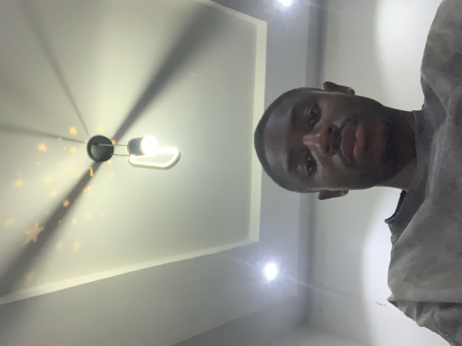A selfie taken from a low angle shows a dark-skinned man with a shaved head wearing a gray shirt. Above him, a modern ceiling light fixture casts rays of light and star-shaped patterns onto a white ceiling. Another recessed light is visible in the background. The overall lighting is dim, but sufficient to illuminate the man's face and the ceiling details. The perspective suggests the man is lying down, looking up at the light.