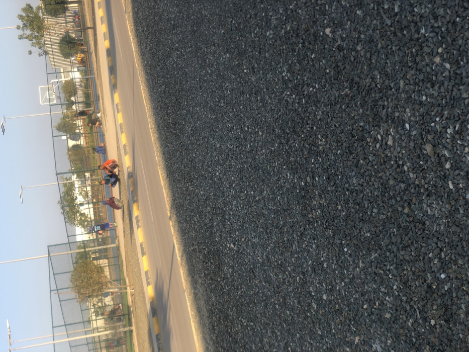 The scene depicts an outdoor sports facility in Hanak, Saudi Arabia, observed from an elevated position. The foreground consists of a dark grey gravel surface, bisected by a sharp diagonal shadow line. This gravel transitions into a paved road featuring yellow and black striped curbing. Beyond the road, a light-colored concrete sidewalk or verge runs parallel to a green chain-link fence enclosing a sports court. Inside the fenced court, multiple individuals are present. Three individuals are crouched or seated on the ground near the fence; one wears a blue top, one an orange top, and another a light-colored top. Further within the court, a person in a blue shirt bearing the number "11" on the back holds a basketball. Additional figures are visible standing and sitting in various areas of the court. A white-backed basketball hoop is positioned on the right side of the court. Several tall streetlights with LED luminaires are spaced around the perimeter of the court. Sparse, small trees are planted along the fence line. In the distant background, light-colored buildings with flat roofs are visible under a clear, light blue sky, indicating a bright, sunny daytime environment.