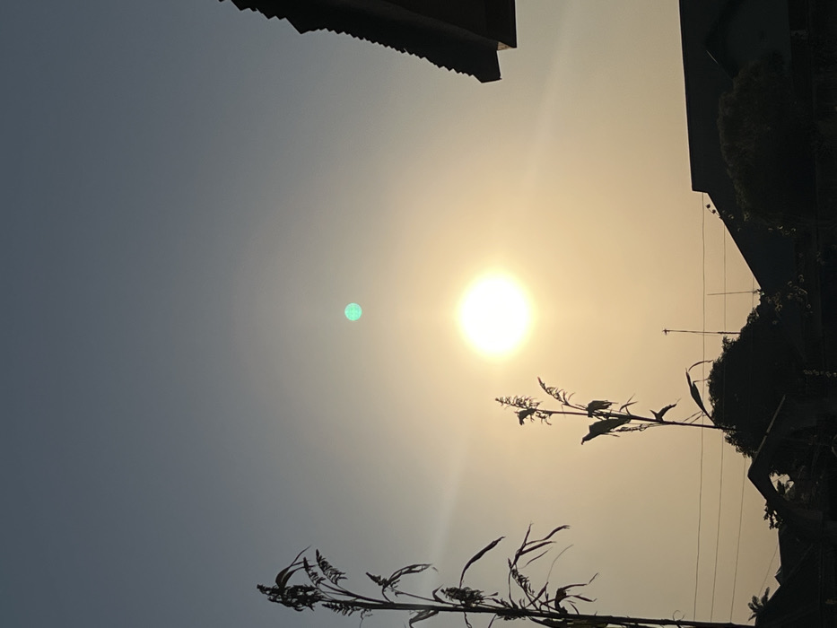 A sun with lens flare illuminates the sky, positioned slightly right of center. Silhouetted plants with thin, stalky stems are prominent in the foreground, both at the bottom and mid-right of the frame. Buildings are visible at the top of the shot. The sky transitions from a light orange-yellow near the sun to a darker blue-gray on the left.