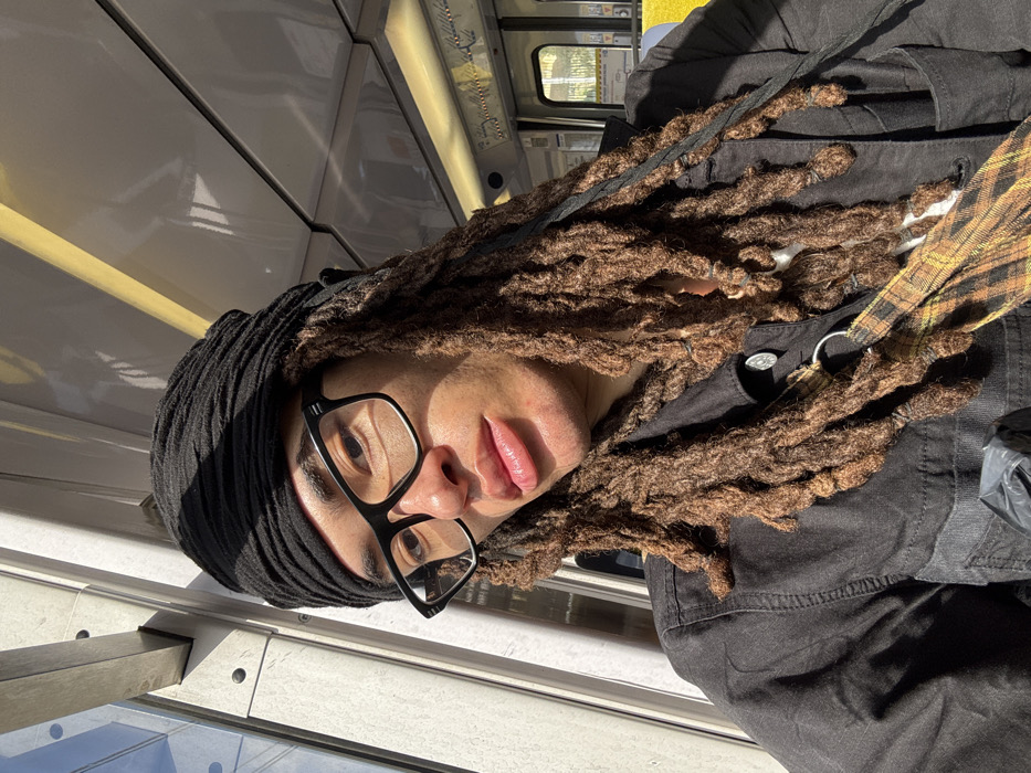 A close-up, front-facing self-portrait depicts an individual within a public transport vehicle in Palaiseau, France. The subject is a person with a medium-brown complexion, wearing a black textured headwrap and black-framed rectangular glasses. Long, brown dreadlocks, some secured with small black bands, extend down the shoulders and chest; a thin black braid is visible on the right side. The individual wears a dark, collared jacket with metallic buttons and chest pockets. A plaid-patterned strap (brown, orange, black) from a shoulder bag with a silver O-ring is visible across the upper torso. The environment is the interior of a vehicle, possibly a train or tram, characterized by a large window on the left admitting strong sunlight. The vehicle features a light-colored, reflective ceiling with linear light fixtures and dark structural elements. Light-colored interior walls are present, and yellow seating is visible through a rear internal window. Dark hanging straps for passengers and a small dark circular fixture are visible on the ceiling in the background. The individual directly faces the camera.