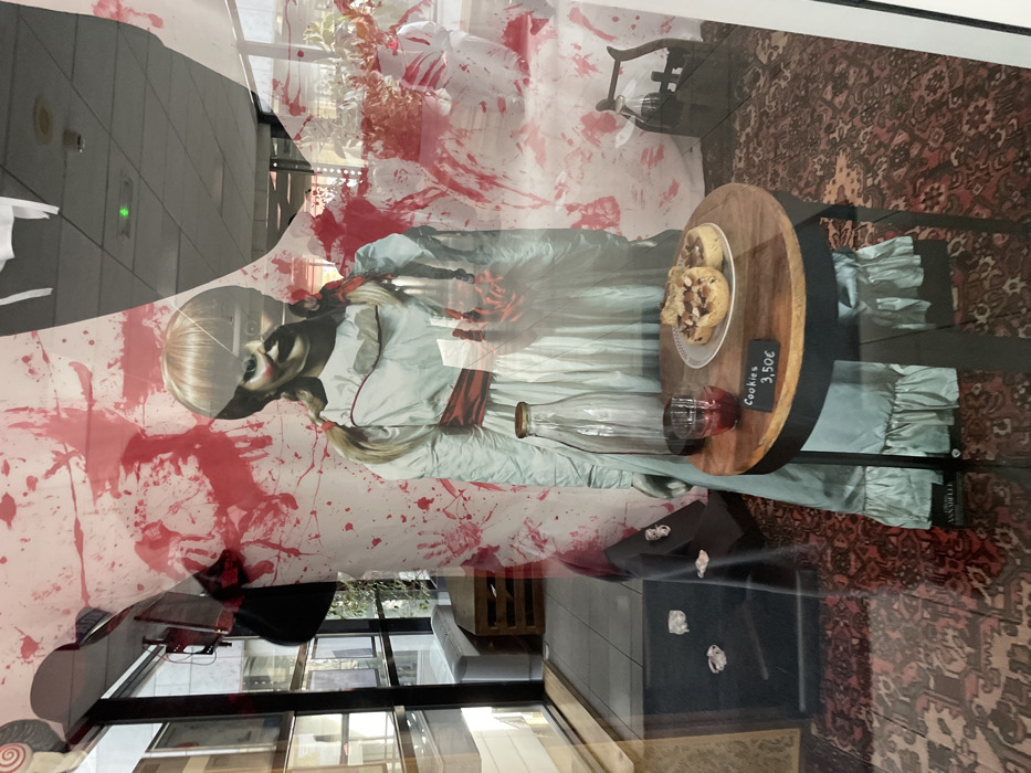 The image depicts a window display located in Schiltigheim, France, viewed through reflective glass. The central subject is a life-sized poster or cutout of the Annabelle doll, characterized by its blonde braided hair, pale skin, prominent eyes, and a wide, unnatural smile. The doll is depicted wearing a light blue dress with a dark red sash. Behind the Annabelle figure, a white backdrop is heavily splattered with red liquid stains resembling blood, alongside several red handprints. In the foreground, positioned before the doll, a small, round wooden table with black legs holds several items. On the table, there is a clear glass bottle, a clear glass containing a dark red liquid, and a white plate presenting three round baked goods, possibly cookies or scones, topped with nuts. A small black sign leaning against the plate displays "Cookies 3,50€". The floor beneath the display is covered by a patterned rug with red and dark tones, exhibiting an oriental design. Reflections on the glass obscure parts of the background and foreground, revealing elements of the exterior or opposite interior environment. These reflections include sections of a building interior with large windows, a white air conditioning unit, a wooden bench, and a ceiling with modular tiles and a green indicator light. No human figures are directly visible within the immediate display area or clearly identifiable in the reflections. The scene is static, indicating a staged arrangement.