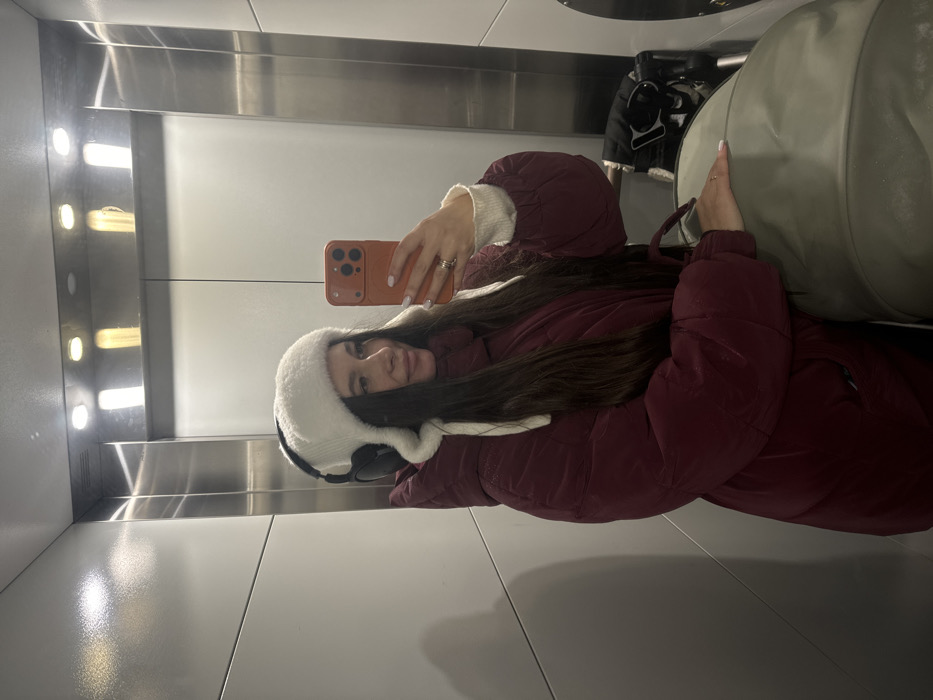 A female subject is observed inside an elevator, presumed to be in Odintsovo, Russia; however, no specific location within the city is identifiable from the image. The subject, with long dark brown hair, wears a white faux-fur winter hat with black over-ear headphones, a maroon puffer coat, and a light-colored ribbed long-sleeved top visible at the wrist. A metallic ring is present on her left ring finger, and her fingernails are manicured with white tips. She holds an orange-cased smartphone in her right hand, pointing it towards her reflection to capture an image. Her left hand rests on the upper edge of a baby stroller, partially visible to her right, featuring a grey or olive-green fabric canopy and black frame elements. The elevator interior consists of reflective metal wall panels with horizontal seams and overhead recessed lighting that casts reflections on the surfaces.