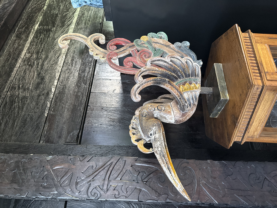 - "An intricately carved wooden bird statue is centrally positioned on an octagonal wooden display table within a structure in Tibubiyu, Indonesia" by FM-0W7MV2, licensed under CC BY 4.0