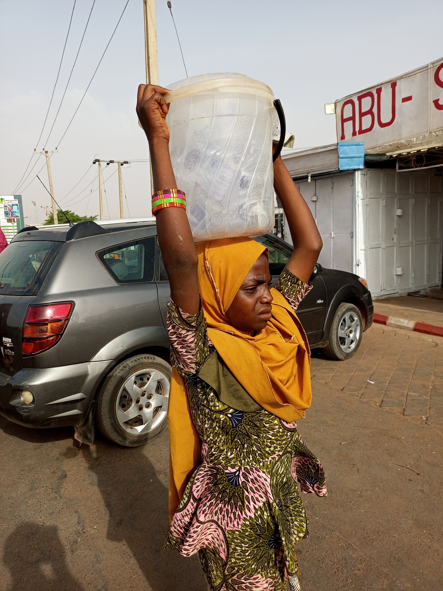 An adult female is depicted from the waist up, centrally positioned, carrying a large clear plastic container on her head, steadying it with both raised hands gripping the rim. The container appears filled with smaller clear plastic bottles or sachets. She wears a mustard yellow head covering (hijab) and a patterned dress featuring green, pink, and dark blue motifs. Colorful bangles are visible on her right wrist. Sweat is present on her face. The scene takes place on an unpaved road or dirt surface in Gombe, Nigeria, with a paved section featuring a red and white painted curb visible to the right. In the background, a dark grey SUV is parked to the left of the woman, and another dark-colored vehicle is partially visible further right. Multiple utility poles and overhead power lines are prominent against a light, hazy sky. A white commercial building with a red sign partially reading "ABU-" is visible on the right, alongside a closed corrugated metal gate. Distinct shadows are cast on the ground, consistent with daylight conditions.