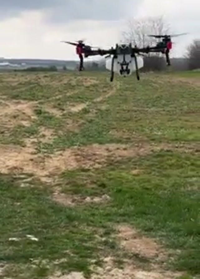 large drone with a white tank attached underneath, flying over a field
