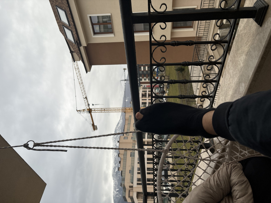 The image presents a first-person perspective from a residential balcony on an overcast day in Sofia, Bulgaria. A person's right leg is visible in the foreground, extended forward while seated, clad in dark pants and a black sock with a hole exposing the big toe. The individual is positioned in a white woven hanging chair, partially visible on the left, with a beige padded garment or cushion also present. A black metal balcony railing with decorative scrollwork runs across the lower portion of the frame. Beyond the railing, a green lawn is visible, bordered by residential buildings. To the immediate right, a building features a light beige facade on its lower level and a darker brown facade on its upper section, topped with a brown tiled roof containing two rectangular skylight windows. In the midground, multiple modern residential structures with light-colored facades and dark balconies are present. At least two prominent yellow construction tower cranes are visible across the urban landscape, indicating active development. In the distant background, snow-capped mountains, characteristic of Vitosha Mountain, rise beneath a grey, cloudy sky. A rope for the hanging chair is visible in the upper left, attached to a metal ring.