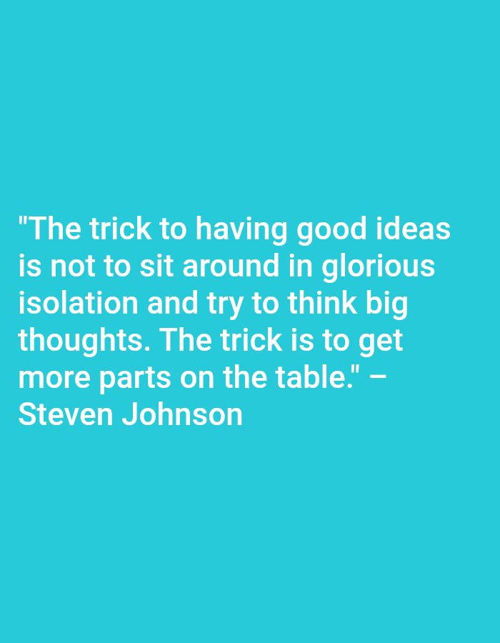 This image displays a digital graphic with white text presented on a solid, uniform teal-colored background. The text is a quote attributed to Steven Johnson. The quote reads: ""The trick to having good ideas is not to sit around in glorious isolation and try to think big thoughts. The trick is to get more parts on the table." – Steven Johnson". The text is centrally aligned and occupies the middle-left portion of the frame. No other visual elements, such as people, discernible subjects, physical objects, actions, interactions, or environmental details of a specific city location, including Ado-Ekiti, Nigeria, are present within the image content.