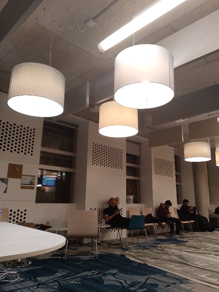 An indoor scene shows a group of people seated in chairs, casually using their phones. The space features prominent lighting fixtures: large, cylindrical lamps hanging from the ceiling, alongside fluorescent lights. White walls with dark, patterned panels are visible behind the seated individuals. A round table occupies the foreground, and a patterned carpet covers the floor. The overall atmosphere is relaxed and informal.
