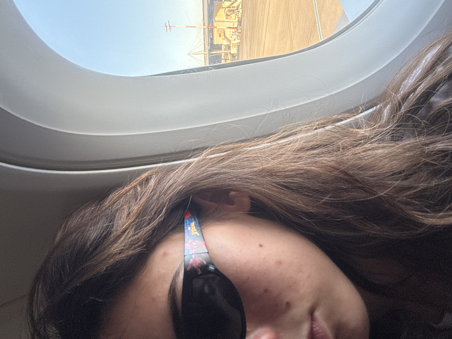 The image displays a close-up, angled view from inside an aircraft. On the left, a person's upper body is partially visible, primarily their left profile and shoulder-length brown hair. The individual is wearing dark sunglasses, the right temple of which features a colorful "Spider-Man" graphic. Minor skin blemishes are present on the visible portion of the person's face, specifically on the cheek and near the nose. To the right, an oval aircraft window frames an exterior scene under a clear blue sky. An airport tarmac, light brown in color, is visible, with various ground vehicles and structures, including what appears to be the wingtip of another aircraft in the lower right. In the distance, a large white cable-stayed bridge with distinctive A-frame pylons is discernible, along with a red and white striped pole on the tarmac. The setting is an airport within the Sdot Dan Regional Council, Israel.