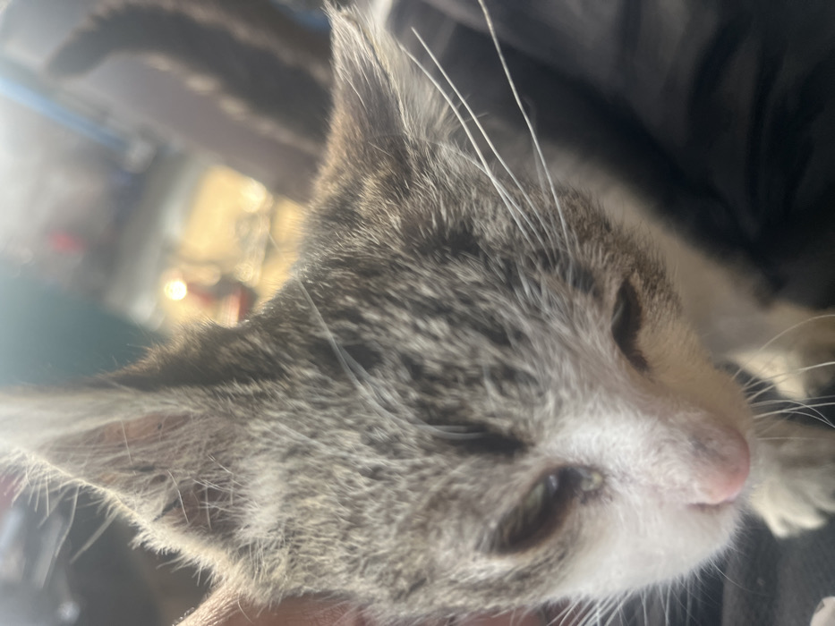 - "A domestic kitten, primarily grey/brown tabby with white fur on its muzzle and chest, is depicted in a close-up, slightly downward-angled view" by FM-s5tUw2, licensed under CC BY 4.0