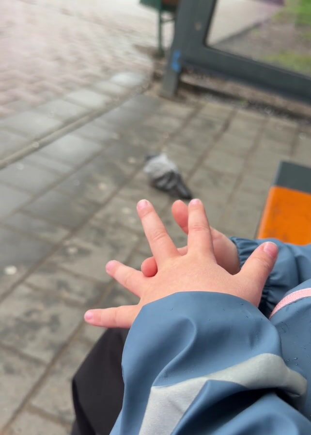 A child sits with their hands clasped, looking at a pigeon resting on a tiled sidewalk. The child is wearing a blue jacket with white and pink trim. The pigeon is gray and white. A bus shelter is partially visible in the background. The sidewalk is wet. The camera focuses on the pigeon, then refocuses on the child's hand.