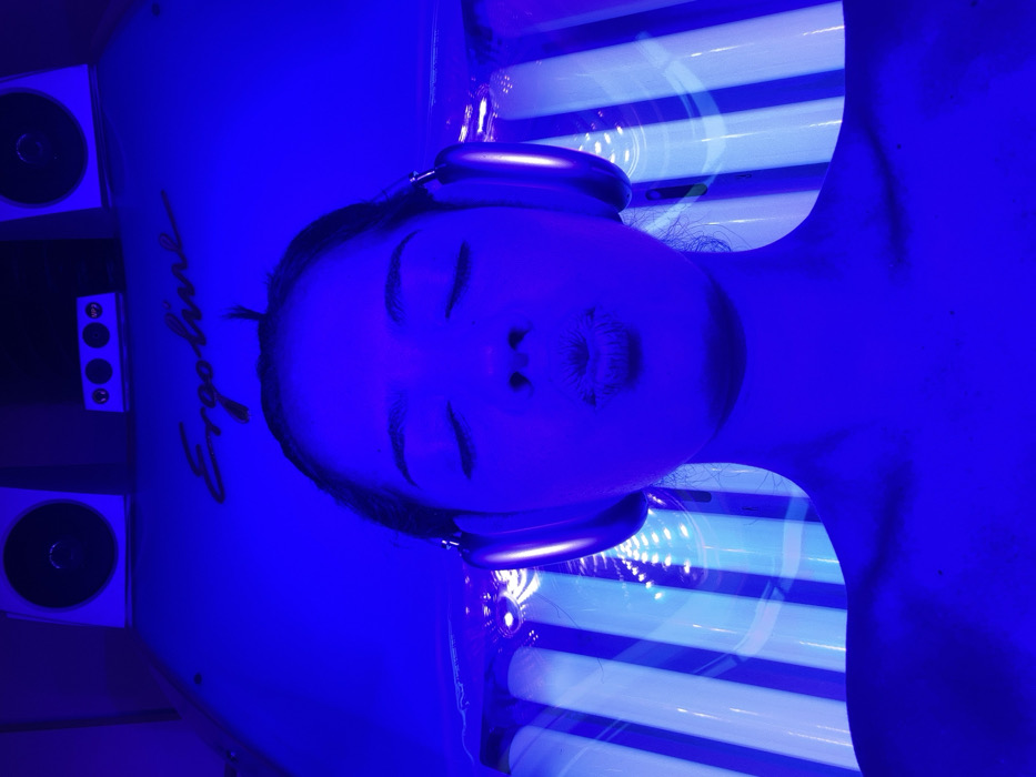 - "The image, taken in the city of Clichy, France, presents a frontal close-up of a young woman inside an Ergoline solarium, bathed entirely in intense blue light" by FM-jW2h42, licensed under CC BY 4.0