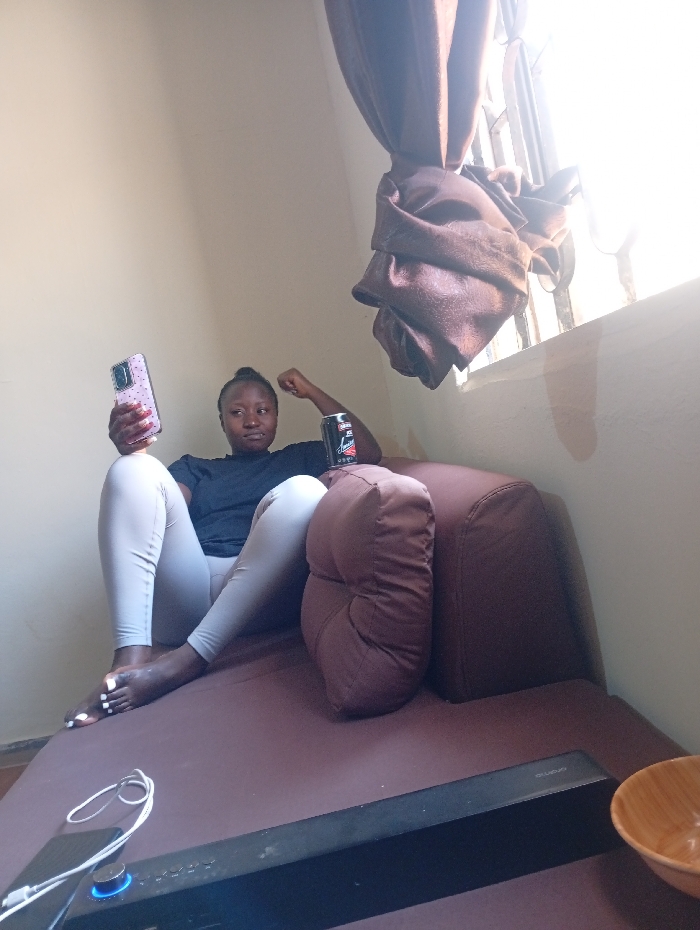 The scene depicts an interior domestic space in Jos, Nigeria. A dark-skinned individual, appearing female, is seated or reclining on a dark brown cushioned surface, which resembles a low couch or daybed. She wears a dark t-shirt and light-colored leggings; her hair is pulled back. In her left hand, she holds a smartphone with a pink patterned case. Her right arm is bent, with the fist clenched in a flexing pose, and a black and white beverage can (appearing to be Budweiser) rests against her right side. Her toenails are painted white. To the right, a window allows bright natural light into the room, partially covered by dark brown curtains. A metal security grille is visible through the window. On the surface in the foreground, a black soundbar with a blue illuminated dial, a white smartphone connected by a white charging cable, and a light-brown wooden bowl are present. The walls are a light, neutral color.