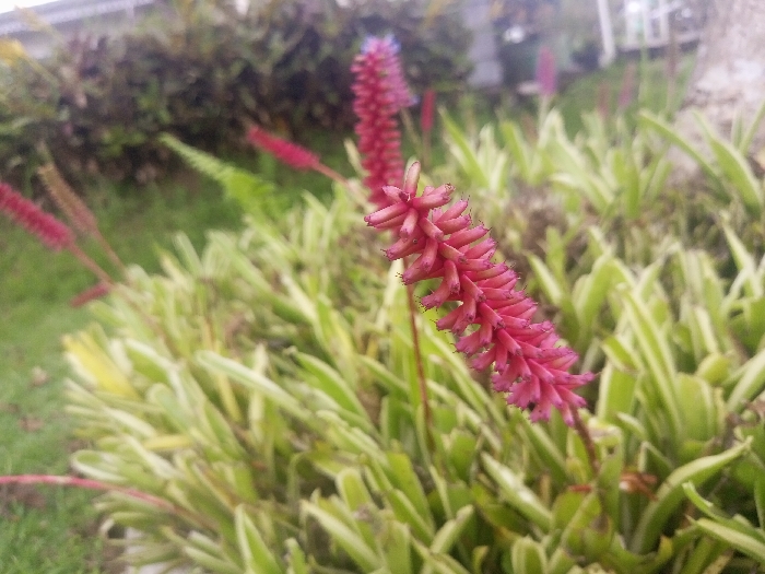 The image displays a close-up, ground-level view of a garden or cultivated area in Ciherang, Indonesia. The central subject is a vivid fuchsia-pink, elongated, spiky inflorescence, approximately 10-15 cm in length, positioned slightly right of the frame's center and rendered in sharp focus. This inflorescence is composed of numerous small, tightly clustered florets or bracts. Several additional, similar pink inflorescences are visible in the blurred background, receding towards the left. The immediate foreground and mid-ground feature out-of-focus, low-lying foliage plants characterized by variegated green and lighter-striped leaves. A blurred expanse of darker green hedge or shrubbery is present behind these plants. A patch of green grass is visible on the far left. The upper background contains indistinct, heavily blurred structures, consistent with parts of a building or a fence, suggesting an outdoor, maintained environment. No human or animal subjects are present. No specific actions or interactions are depicted.