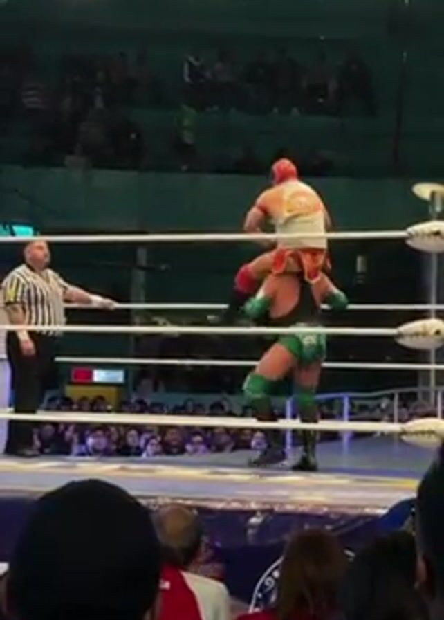 wrestling match in a wrestling ring. A referee stands to the side. Two masked wrestlers are in the ring. One wrestler, wearing green wrestling gear, is bent over. The other wrestler, wearing red and white, is on his back. The wrestler in red and white performs a twisting move, bringing them both to the ground. An audience is visible in the background. Lighting fixtures hang from the ceiling.
