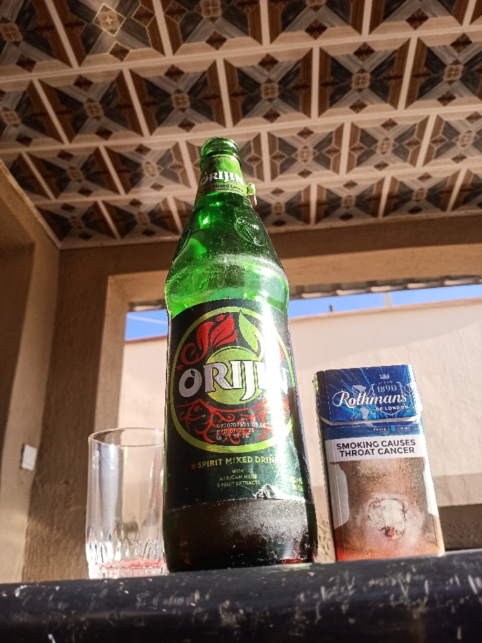 The image, captured in Jos, Nigeria, presents a low-angle view of three items positioned on a dark, horizontal surface beneath a patterned ceiling. Centrally featured is a green glass bottle of "ORIJIN Spirit Mixed Drink with African Herb & Fruit Extracts," which is uncapped and appears partially consumed, showing condensation on its lower portion. To the left of the bottle, a clear, empty glass with a textured base is present. To the right, a blue and white pack of "Rothmans of London" cigarettes stands upright, prominently displaying a graphic health warning that reads "SMOKING CAUSES THROAT CANCER." The overhead structure is a tiled ceiling adorned with repeating geometric patterns in shades of brown, beige, and dark gray/blue. In the background, out-of-focus light-brown building elements are visible, with a narrow strip of clear blue sky above them, indicating an outdoor, possibly shaded, setting under daylight conditions. No individuals are present in the scene.