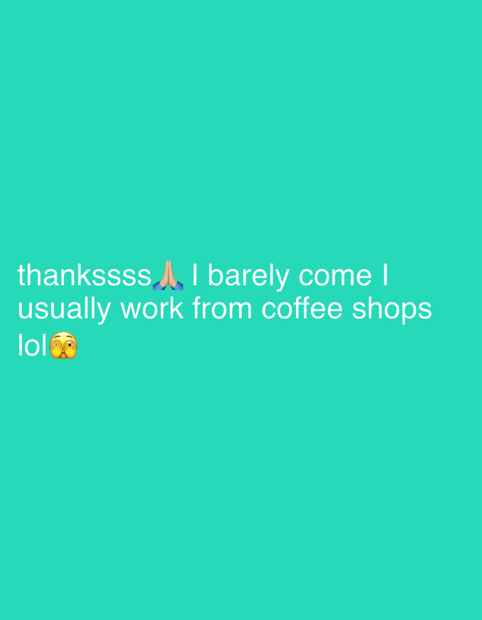 The scene, located in Bnei Brak, Israel, consists solely of white text and two emojis superimposed on a solid teal background. The text reads: 'thankssss 🙏 I barely come I usually work from coffee shops lol 🙈'. A praying hands emoji follows 'thankssss', and a face with hands over eyes emoji follows 'lol'. No individuals, physical objects, or environmental features are present beyond this digital overlay.