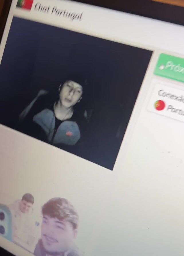 close-up of a laptop screen displaying a "Chat Portugal" interface. Two video feeds are visible, one of a person in a dimly lit setting wearing a black beanie and a dark jacket with a red patch, and another of two people holding a phone up to their face, appearing to be on a video call. The laptop is placed on a wooden surface, and other objects like a bracelet and a piece of paper are visible in the surrounding area. The person recording the video briefly moves the camera away from the laptop, then back to the screen.