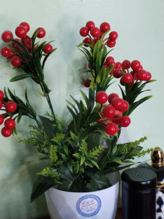 - "The scene depicts an artificial plant with green foliage and numerous clusters of bright red, spherical berries, contained within a white, geometrically faceted pot" by FM-F7Esh2, licensed under CC BY 4.0
