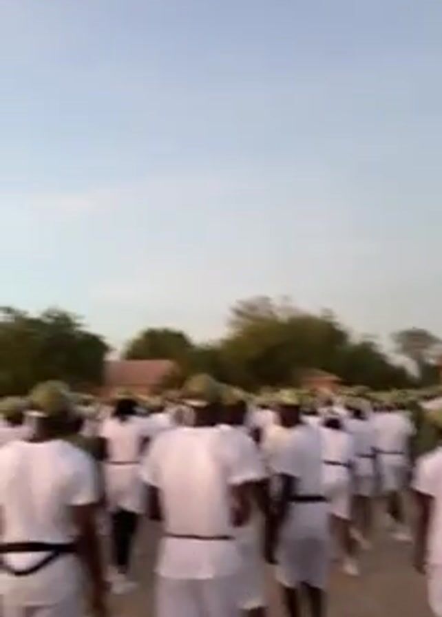 large group of people, seemingly recruits, dressed in white shirts and shorts with olive green caps. They are standing in a field under a sky with a pale pink and blue sunset. Some trees and buildings are visible in the background. People are moving around, forming into groups, and adjusting their clothing. The camera moves with a person in the crowd.