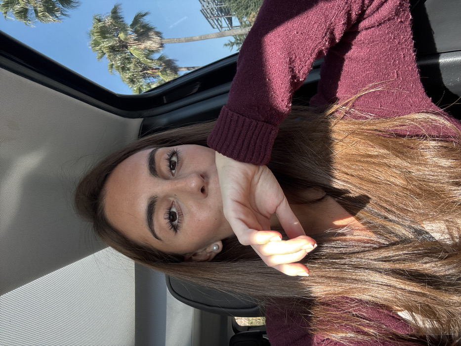 A female subject is depicted inside a vehicle, situated in Interlomas, Mexico. She has long, dark brown hair and wears a marl maroon long-sleeved sweater, which exhibits fabric pilling. Her right hand, with light-colored fingernails, is positioned over her lower face, partially covering her mouth and chin. A white pearl stud earring is visible on her left earlobe. Strong, direct sunlight illuminates the scene, casting distinct shadows across her hair and sweater. The vehicle's interior includes a dark seat back and a light-colored overhead panel, likely a sunroof or headliner. Through the passenger window, a clear blue sky is visible above multiple tall palm trees and a lower metal structural framework partially obscured by green vegetation.