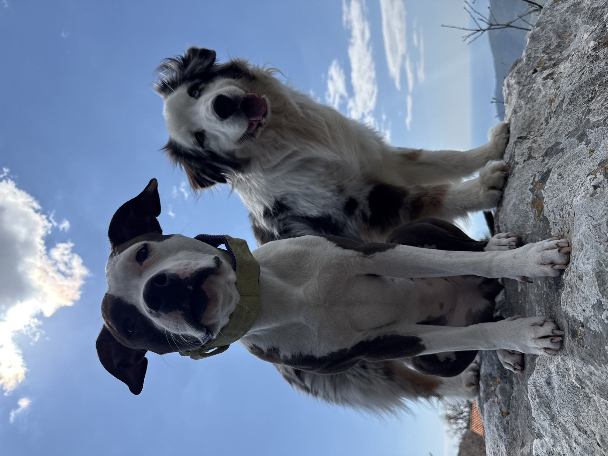 Two dogs are positioned atop a rock structure against a backdrop of blue sky and clouds. The bottom dog is a brown-and-white short-haired dog wearing a green collar. The top dog is a long-haired black and white dog. The location appears to be Lapčići, Montenegro, given the rocky terrain and type of sky.