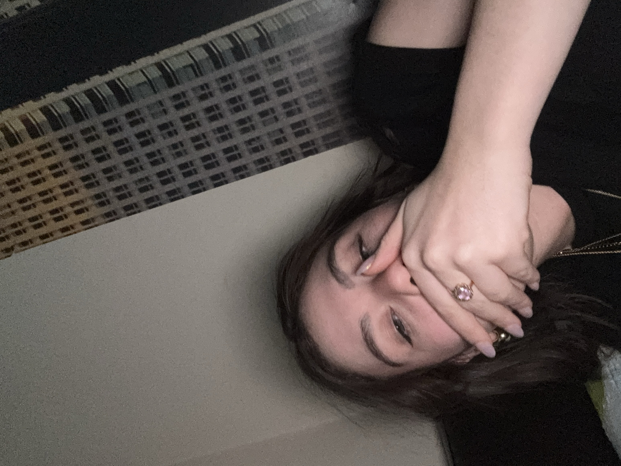 A woman is lying down. She is wearing a black shirt and has a gold necklace. Her face is visible, and she has her hand over her mouth. She is wearing a ring on her left hand. The background is a wall and a textured surface, possibly a headboard. There is no information to determine if this is in Mirandela, Portugal.