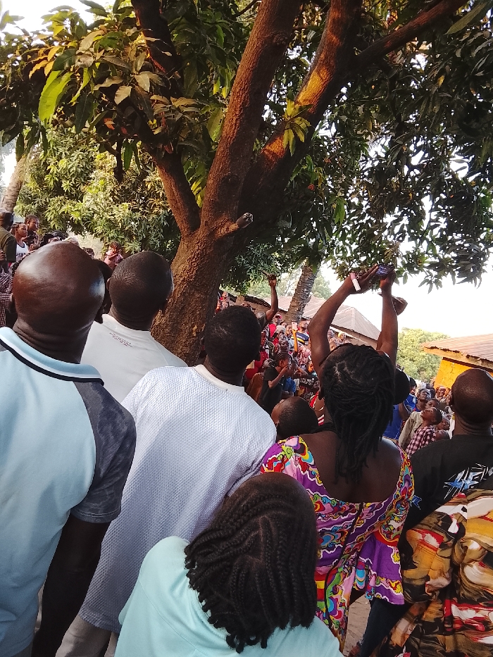 The image captures a dense outdoor gathering of individuals in Tabu, Nigeria. The scene is dominated by a large tree featuring a thick, reddish-brown trunk and abundant green foliage, extending from the midground upwards. Sunlight illuminates sections of the tree trunk. In the foreground, observed from behind, are several individuals. From left to right: a man with a bald head wearing a light blue and dark gray polo shirt; a man with a bald head in a white t-shirt; and a man in a white textured long-sleeved top. Below them, the braided hair and light blue shirt of a shorter individual are visible. To the right, a woman with dreadlocks, wearing a vibrant purple, pink, and yellow patterned dress, has both arms raised overhead, holding a mobile phone horizontally, appearing to record or photograph an elevated subject. Another man's back, clad in a dark shirt, is visible on the far right. Beyond these foreground figures, a large crowd extends into the midground and background. The majority of these individuals are looking upwards. Several people within the crowd have raised arms, with one visible instance of a raised fist. In the far background, amidst additional trees, rudimentary building roofs are partially visible. The scene is illuminated by natural daylight.