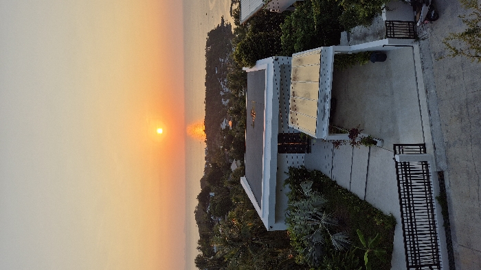 An elevated, downward-angled view captures a residential property in Baan Wang Ta Kien, Thailand, during sunset. The sun is low on the horizon, slightly left of center, casting a vivid orange glow across the sky and creating a prominent vertical reflection on the ocean's surface. In the foreground, a concrete road provides access to a black metal gate with white concrete pillars, marking the entrance to the property. A light-colored scooter is parked near the gate on the right. The primary structure is a modern, white-walled building with a flat, dark roof. Its main entrance features dark double doors, accessible via a paved pathway from the gate. To the right of the main building, a covered carport with a light-colored roof shelters a concrete parking area, which contains a black refuse bin. Lush tropical vegetation, including palm-like plants and various shrubs, frames the property. Beyond the immediate residence, a dense expanse of tropical trees covers sloping terrain leading to the coastline. Scattered buildings are visible within the tree canopy and along the shore. The ocean occupies the mid-to-far background. No individuals are present in the image.