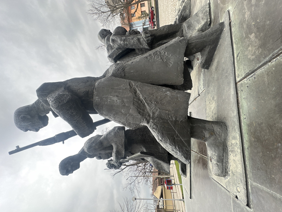 The image displays a multi-figure sculptural monument situated outdoors in Silistra, Bulgaria, under an overcast sky