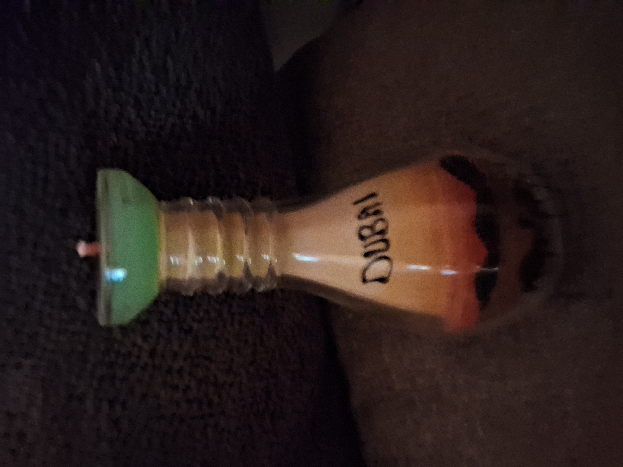 The image displays a clear glass decorative object, likely an oil lamp or candle, positioned centrally. The object features a bulbous base that tapers into a ribbed, cylindrical neck, capped by a translucent, light green, cup-shaped component. A short, light pink wick protrudes vertically from the center of this green top. Inside the glass vessel, layers of colored sand are visible, forming a stylized landscape. The bottom layer consists of dark brown or black sand shaped into undulations, suggesting hills or dunes. Above this, a prominent layer of reddish-orange sand transitions into a lighter, pale beige sand. The word "DUBAI" is inscribed in black capital letters on this lighter sand layer, oriented horizontally. The object is set against a uniformly dark, out-of-focus background, consistent with a textured fabric surface, appearing dark brown or black. No individuals, further objects, actions, or specific environmental details beyond this immediate setting are discernible.